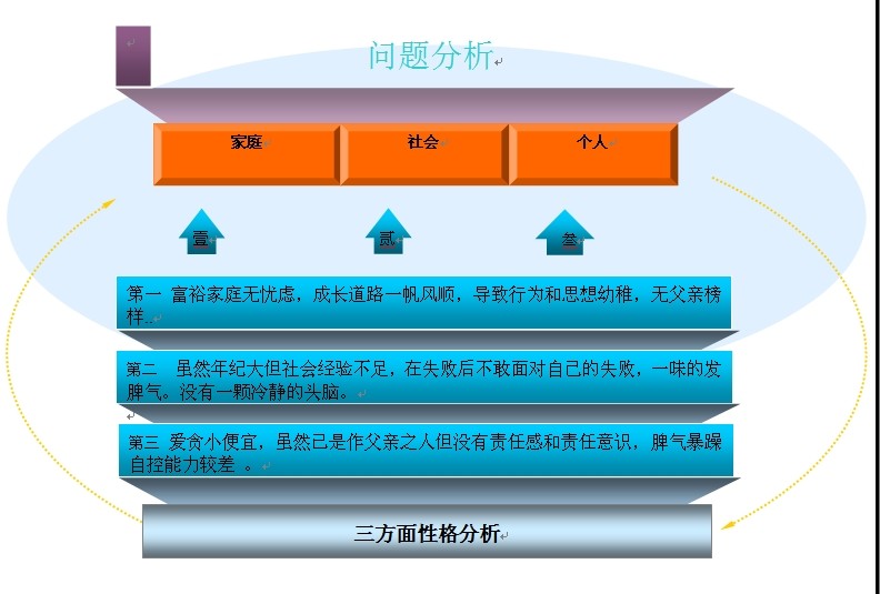 老三(化名) 男 25歲初中文化 ,已婚(父親)入校原因:自愿后經(jīng)發(fā)現(xiàn)李老三同學(xué)本身年齡很大,但心里年齡較小所做事情幼稚,愛(ài)貪小便宜,脾氣較差,自控能力較差,在家打老婆,更缺乏一個(gè)做父親的責(zé)任。