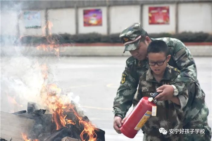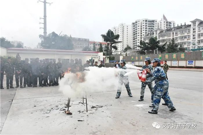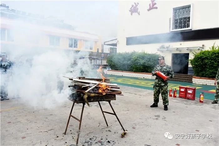 接著開始了消防撲救演練。操場上的木材點(diǎn)燃后,火苗迅速變成了熊熊大火,老師開始現(xiàn)場演示滅火設(shè)備(滅火器、高壓水槍、滅火毯、濕毛巾)的使用方法,并指導(dǎo)全部學(xué)生親自操作演練。