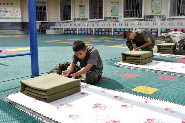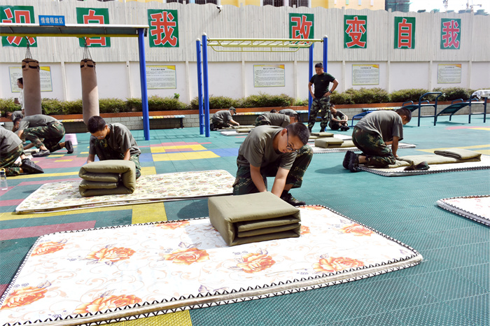 在日常的管理中,老師就對學生的內(nèi)務(wù)整理進行嚴格的要求和具體的指導,如:怎樣鋪平被子,怎樣折疊,左右折疊的長度是多少,疊完后怎樣形成菱角等等。在老師的一聲令下后,比賽開始啦。同學們便本著“既快又好”的原則,使出渾身解數(shù),各展奇招,折、壓、量、磨、捏、修等手法嫻熟,盡全力完成比賽。短短三分鐘,同學們就精雕細琢出一床床棱角分明,方方正正的“豆腐塊”,整整齊齊地放在墊子的一角,等待評比。活動現(xiàn)場,同學們熱情高漲,氣氛異常熱烈。