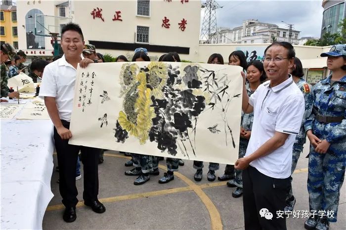 聯(lián)誼匯演結(jié)束,聽說老領(lǐng)導(dǎo)們都身懷絕技,在繪畫、書法上都頗有造詣,孩子們豈能錯(cuò)過這樣的好機(jī)會(huì),迫不及待地與老師一起把筆墨紙硯準(zhǔn)備好,列隊(duì)等著觀摩學(xué)習(xí)。李主任、“五老”鄧成列、徐繼泉等領(lǐng)導(dǎo)不辭辛勞,現(xiàn)場毫不吝嗇地?fù)]毫潑墨,只見筆墨飛舞間,一幅幅遒勁有力、氣勢非凡的的書法作品和活靈活現(xiàn)的《向日葵》水墨畫躍然紙上,呈現(xiàn)在大家眼前,令人賞心悅目,師生們贊不絕口,力量倍增。