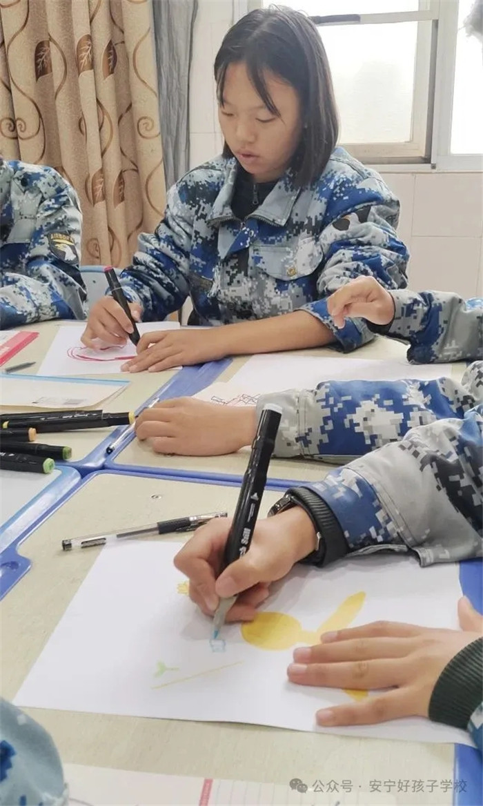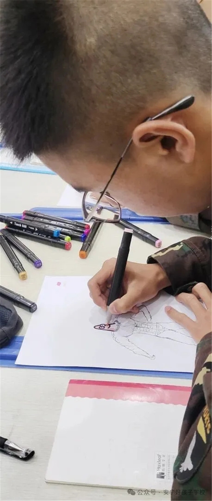 在“我手繪我心”創(chuàng)作環(huán)節(jié),藝術(shù)成為了孩子們表達(dá)內(nèi)心的獨特語言。有的同學(xué)用細(xì)膩筆觸勾勒寫實自畫像,將外在形象與內(nèi)在性格巧妙融合;有的用繽紛色彩堆砌出奶油蛋糕,讓甜蜜的渴望在紙面流淌;有的繪制身著偶像球衣的自己,展現(xiàn)逐夢路上的堅定身影;更有的勇敢以灰調(diào)筆觸直面內(nèi)心的陰霾,讓迷茫與困惑在創(chuàng)作中得到溫柔安放。正如維特根斯坦所言:“語言的界限即世界的界限!碑(dāng)文字難以精準(zhǔn)描繪抽象、隱秘的情感時,畫筆便成為了傾訴內(nèi)心的專屬語言。創(chuàng)作過程中,孩子們時而凝神思索,時而揮筆疾書,那些原本模糊的“心的形狀”逐漸清晰可見。