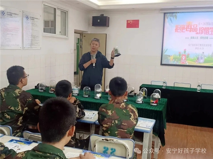 在第38個“國際禁毒日”即將到來之際,為切實增強青少年識毒、防毒、拒毒能力,2025年6月24日上午,云南省第二強制隔離戒毒所教育矯治科警官羅文杰、安寧市禁毒機制辦專職副主任楊志兵、安寧市禁毒機制辦警官周霖、光明社區(qū)禁毒專干楊麗華等領(lǐng)導(dǎo)走進我校,為全體師生帶來了一場極具教育意義的禁毒普法宣講活動。