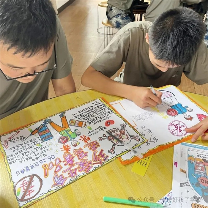 下午,一場充滿創(chuàng)意的禁毒手抄報創(chuàng)作活動在多功能室火熱開展。同學(xué)們將上午所學(xué)轉(zhuǎn)化為藝術(shù)表達,用漫畫揭露毒品騙局,用色彩描繪無毒未來。一幅幅作品構(gòu)思巧妙、寓意深刻,既展現(xiàn)了同學(xué)們的藝術(shù)才華,更表達了他們對毒品堅決抵制的決心。