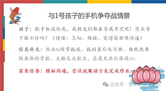 在“手機爭奪戰(zhàn)”中,扮演父母的同學嚴肅地對“兒子”說:“作業(yè)寫完才能玩游戲!薄澳愀静欢@場游戲對我的意義!輸?shù)舯荣愱犛褧R我!”扮演叛逆少年的同學情緒激動地反駁道。雙方各執(zhí)一詞,互不相讓,最后只能通過爭吵來表達自己的想法,完全忘記了要理智溝通與關心。