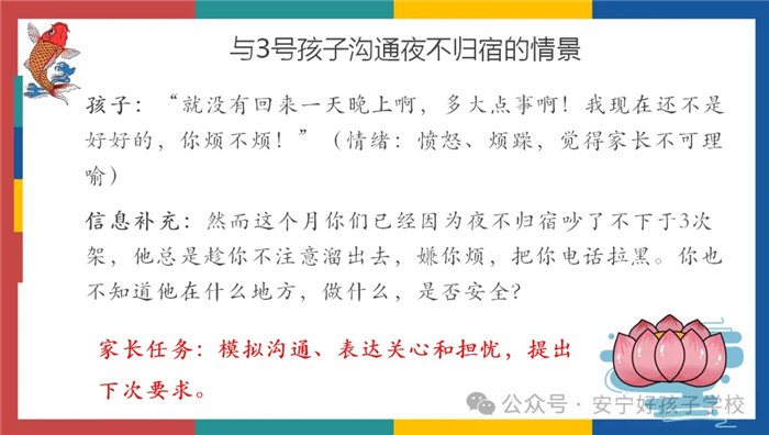 最激烈的當屬“夜不歸宿”情景。扮演父母的同學焦急又心疼地說:“你知道我多擔心嗎?”而扮演叛逆的同學卻滿不在乎地甩出一句:“就通宵一次怎么了?你們管太寬!”盡管每個“父母”都拿到了“保持冷靜,理智溝通”的劇本提示,但面對“熊孩子”的叛逆,幾乎所有人都下意識地選擇了“說教”,試圖用這種方式讓孩子聽話。課后,有同學感慨道:“現(xiàn)在終于知道,為什么覺得父母脾氣不好了,原來面對不聽話的孩子,真的很難控制自己的情緒……”