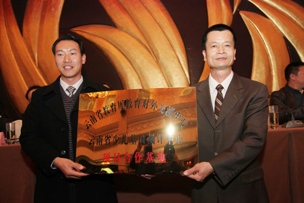 云南省教育廳外事處調(diào)研員、基因測(cè)評(píng)中心主任劉超(右)向安寧市好孩子教育培訓(xùn)學(xué)校校長魯植(左)授牌