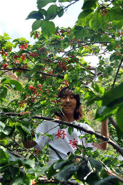 剛出校門,同學們就興奮不已,到目的地看到漫山遍野的櫻桃樹,紅紅的櫻桃點綴在其中,在陽光的照射下,閃著誘人的光,對采摘更是大感興趣,迫不及待的跑到樹下邊吃邊摘。園里不時有同學說道:哇,這個真大真甜!一定要多摘些回去給同學們也嘗一嘗......你看,有的奮力踮起腳尖,吃力地將樹枝壓彎,將摘下的櫻桃放進小框里;有的巧借竹鉤,挑選著圓潤飽滿的;有的干脆用梯子爬到高處,摘著最大最紅的......整個櫻桃園里,不時傳來了同學們陣陣歡快的笑聲。