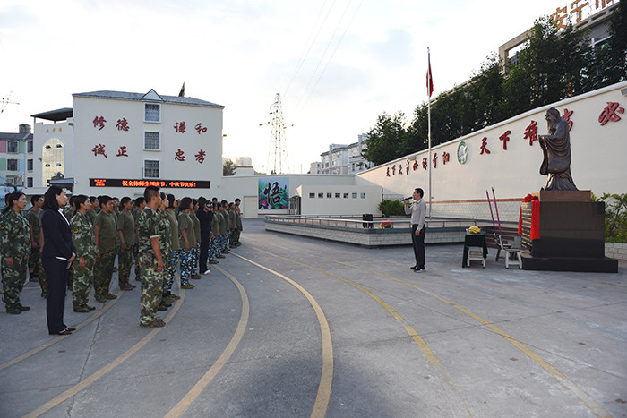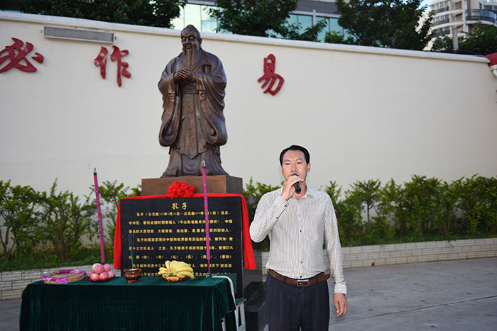 晚餐前,全體師生莊嚴地站在操場上,跟隨魯植校長一起祭拜孔子雕像。魯校長說道:“祭拜孔子雕像,不僅僅要表達對孔子的崇敬之情,更在于可以時時刻刻提醒我們要立德修身、勤而好學(xué),繼承和發(fā)揚中華民族的優(yōu)良傳統(tǒng)。我們要以孔子的智慧和人格為標尺,丈量每天的進步與成長,去遇見更好的自己!痹谇f重而簡樸的儀式下,孩子們深切感受到了傳統(tǒng)文化的魅力。