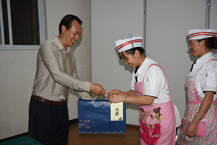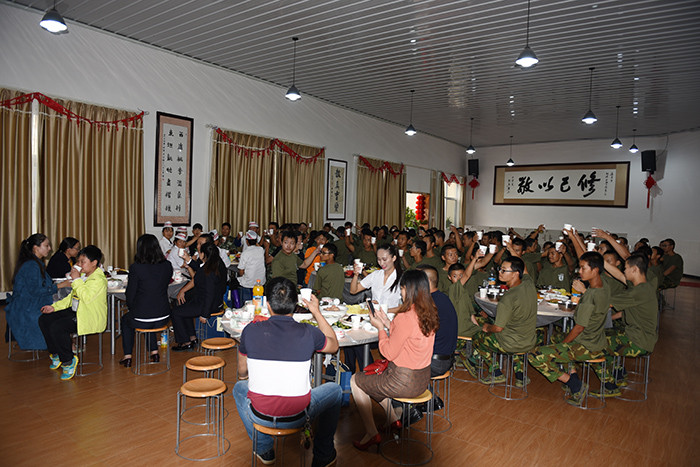 全體師生向孔子像行完鞠躬禮后,進入食堂,準備享用美味。副校長毛積敏擔任了本次活動的主持人,首先給孩子們介紹了中秋節(jié)的來歷及習(xí)俗,隨后魯校長作了中秋致辭,并陪著大家一起共進晚餐,師生們紛紛舉杯相互表達節(jié)日祝福。為感謝幾年如一日、無怨無悔扎根于學(xué)校的老師們,魯校長精心準備,給全體教職工發(fā)放了精美禮品進行慰問。席間,孩子們迫不及待、自告奮勇上臺自我介紹或表演節(jié)目,把晚餐的氣氛推向了高潮。