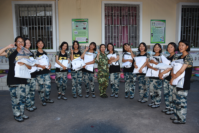 領(lǐng)到新裝的孩子非常興奮,不時說著“真好看”、“好喜歡”、“好漂亮”、 “太幸福了”之類的話語,并迫不及待地?fù)Q上漂亮的校服,站在鏡子面前,左照照、右照照,是那么合身、那么帥氣、那么有朝氣。你瞧,潔白的T恤和外套,配上黑色的褲子,加上白色運動鞋,既莊重又活潑,既樸素又大方。我校使用的迷彩服和運動服作為指定服裝,相得益彰,一個嚴(yán)肅,一個休閑,正好符合學(xué)校的“嚴(yán)管理,善對待”的教學(xué)理念,更體現(xiàn)了學(xué)校的人文關(guān)懷。