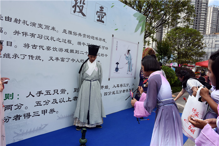 表演結(jié)束后,同學(xué)們還饒有興致地到遙岑樓書院參觀,臭美留影。隨后又興致勃勃地參加了 “旱地龍舟、投壺、漢服體驗”等多個端午主題游園游戲。孩子們玩得十分開心,每個游戲都全情投入,贏得了不少獎券,兌獎時,幸福難以言表;顒蛹染邐蕵沸裕指钊氲刿`行了時代文明新風,弘揚了中華傳統(tǒng)文化。