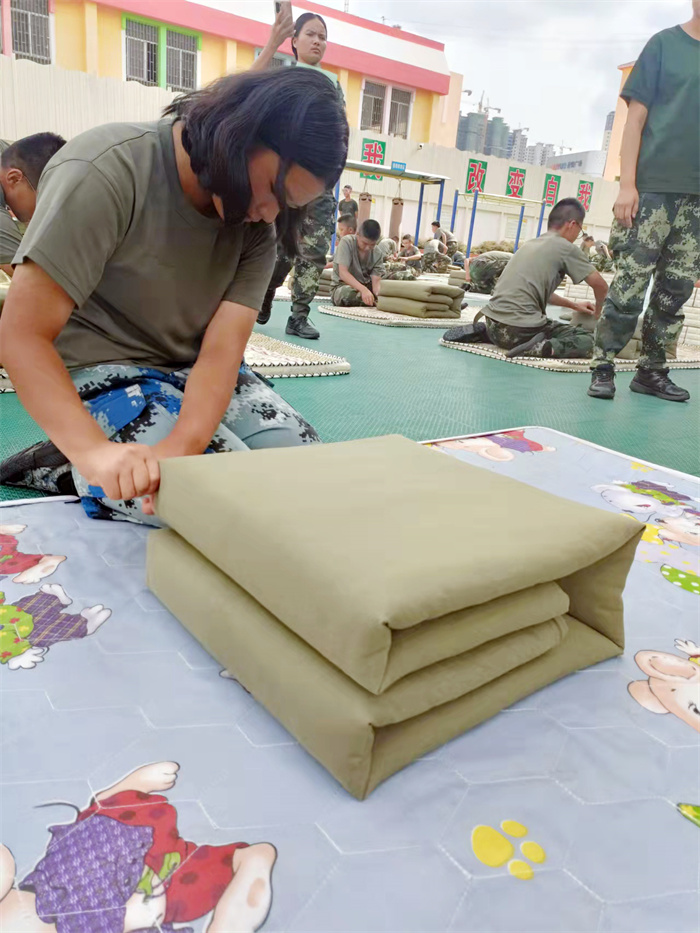 在日常的管理中,老師就對學生的內(nèi)務(wù)整理進行嚴格的要求和具體的指導,如:怎樣鋪平被子,怎樣折疊,左右折疊的長度是多少,疊完后怎樣形成菱角等等。在老師的一聲令下后,比賽開始啦。同學們便本著“既快又好”的原則,使出渾身解數(shù),各展奇招,折、壓、量、磨、捏、修等手法嫻熟,盡全力完成比賽。短短三分鐘,同學們就精雕細琢出一床床棱角分明,方方正正的“豆腐塊”,整整齊齊地放在墊子的一角,等待評比。活動現(xiàn)場,同學們熱情高漲,氣氛異常熱烈。