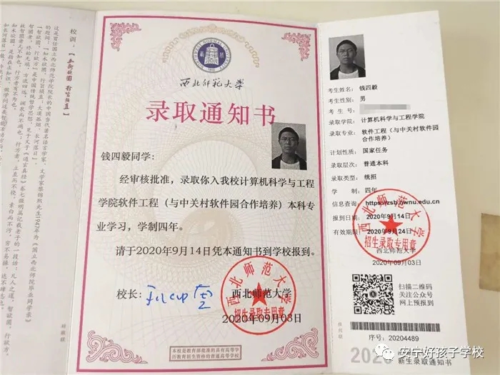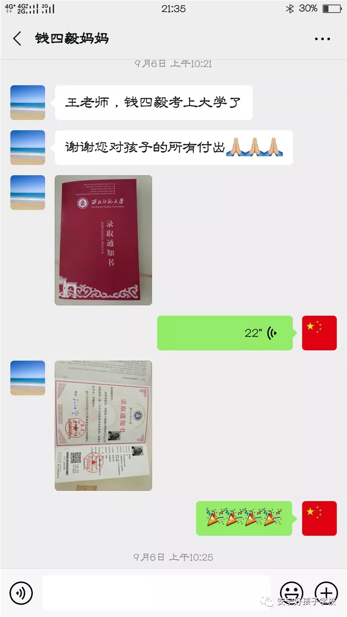 的確,經(jīng)過好孩子學(xué)校10個月的學(xué)習(xí),曾經(jīng)少不更事的錢四毅陽光了、自信了、長大了、懂事了!不但懂得了父母的艱辛與無私的愛,還回歸學(xué)校繼續(xù)就讀,憑借超乎常人的堅(jiān)韌和頑強(qiáng),深夜挑燈,寒窗苦讀,查缺補(bǔ)漏,迅速追趕,最終考上自己理想的大學(xué)。