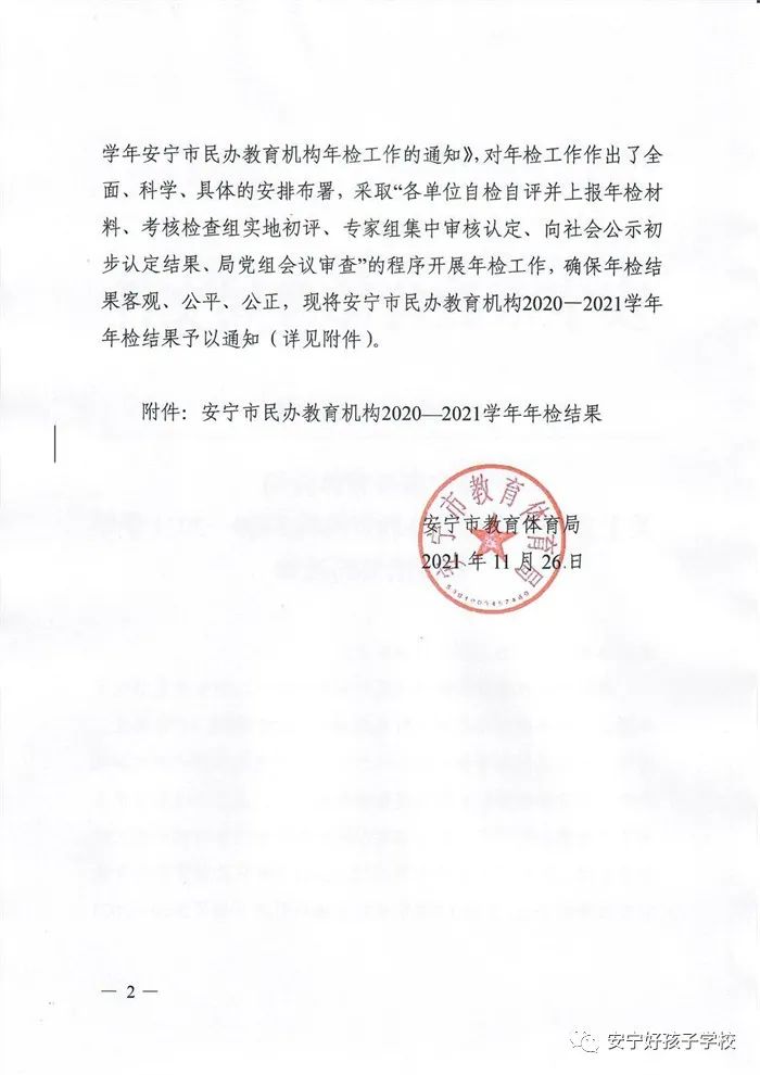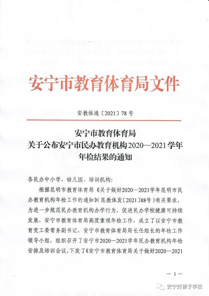2021年12月3日,安寧市教育體育局發(fā)布了《關于2020—2021學年度安寧市民辦教育機構年檢結果公示》,我校喜獲“2020—2021學年度辦學水平考核合格單位”榮譽稱號!