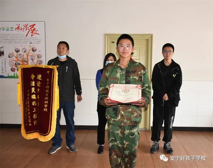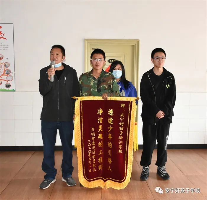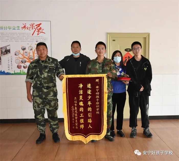 2022年5月4日,我校學(xué)生李昱峰順利畢業(yè)。在出營(yíng)儀式上,他的家長(zhǎng)將繡有“迷途少年的引路人,凈潔靈魂的工程師”字樣的錦旗贈(zèng)給學(xué)校,以此感謝學(xué)校和老師對(duì)孩子的辛勤培育,學(xué)校教務(wù)主任張汝云代表學(xué)校接過(guò)了這面沉甸甸的錦旗。
