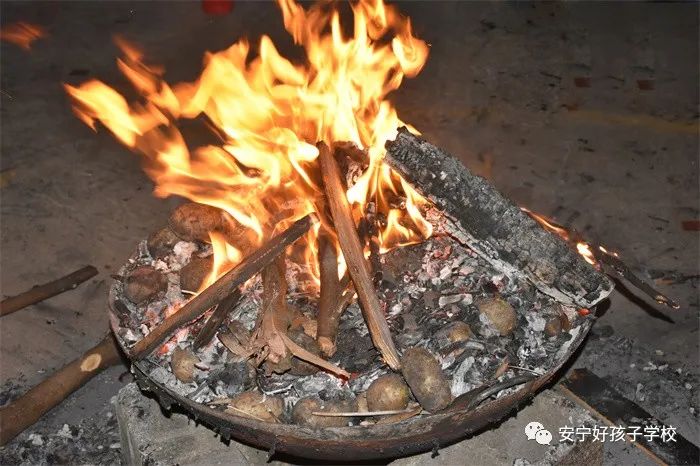 晚上七點(diǎn),大家期待已久的篝火晚會(huì)正式拉開帷幕。在極具民族特色的“納西三部曲”、“左腳舞”、“三跺腳”等音樂(lè)聲中,師生們圍著熊熊燃燒的篝火歡快地唱著、跳著,載歌載舞。即使沒(méi)有舞蹈功底,也可以樂(lè)在其中,老師喊停的時(shí)候還嗨得忘我,沉醉在這歡樂(lè)的海洋中,想必也沒(méi)有什么比這個(gè)更燃的了。孩子們玩累了,就開啟了云南人特有的模式——燒洋芋。喝著飲料,吃著香噴噴的洋芋,別提有多開心了。