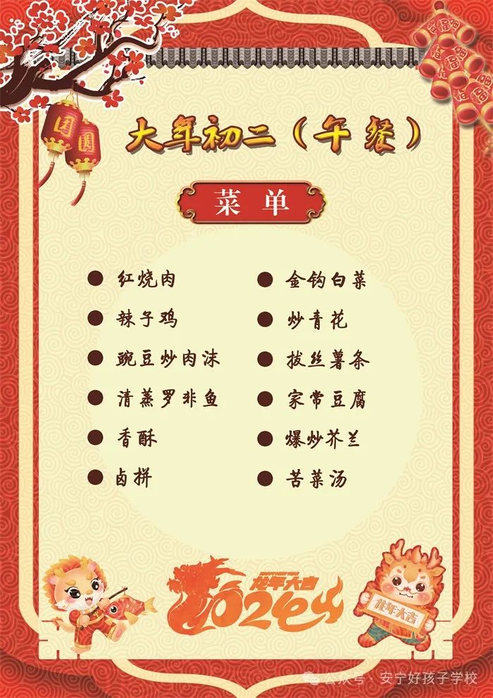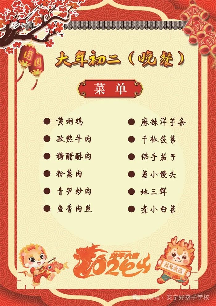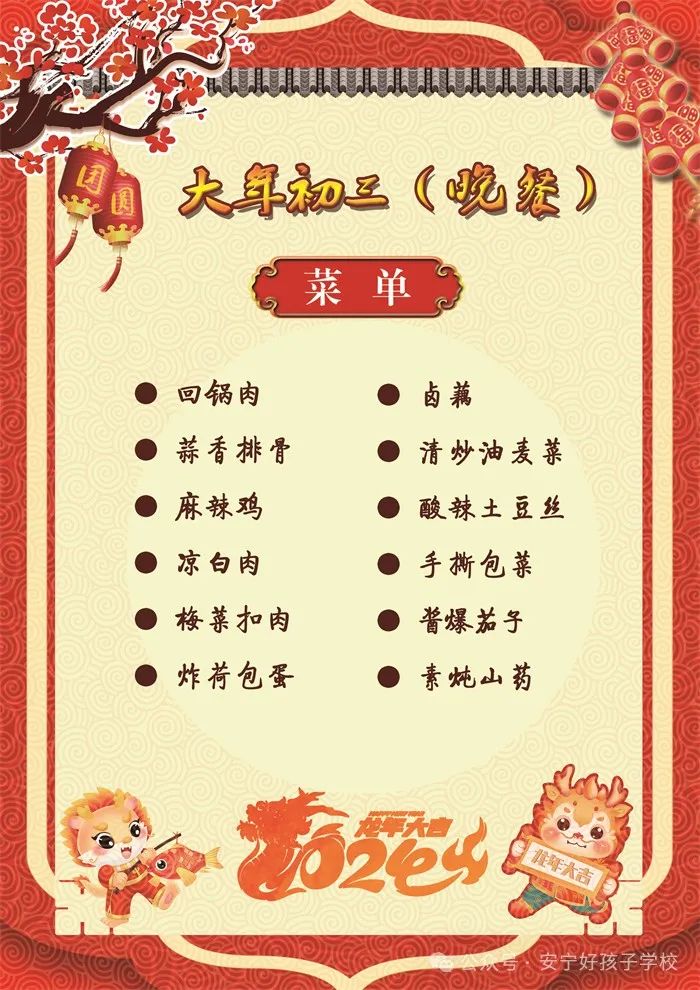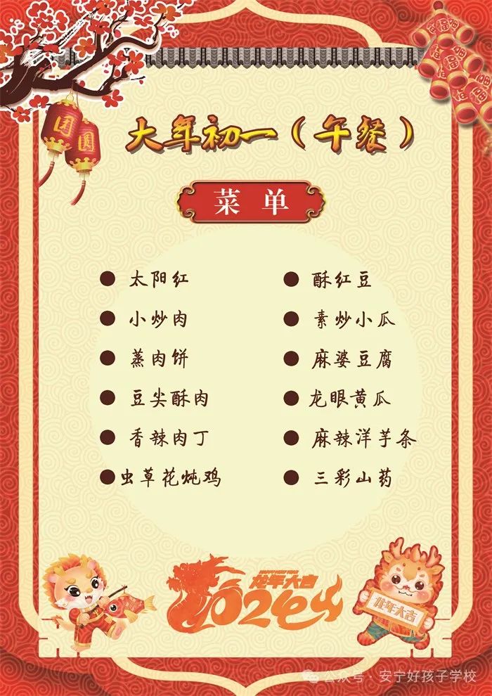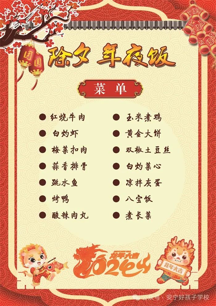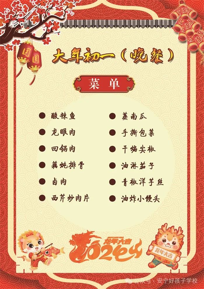 過(guò)年了 !孩子們吃什么?這是學(xué)校領(lǐng)導(dǎo)幾天來(lái)一直思考的問題。經(jīng)過(guò)與學(xué)校營(yíng)養(yǎng)師、食堂廚師們多次商議后,本著營(yíng)養(yǎng)、健康、不浪費(fèi),又要保證孩子每餐都能吃上新鮮可口的飯菜,終于議定了菜單,現(xiàn)予以公布。祝孩子們新年快樂!祝全體家長(zhǎng)龍年吉祥、闔家幸福安康!