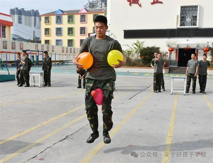 “太空漫步”每組8名成員參與,參賽者腋下夾兩個氣球,腿上夾一個氣球,將氣球運到終點傳遞給下一名隊員,最終8人走完,用時最短的小組取勝。