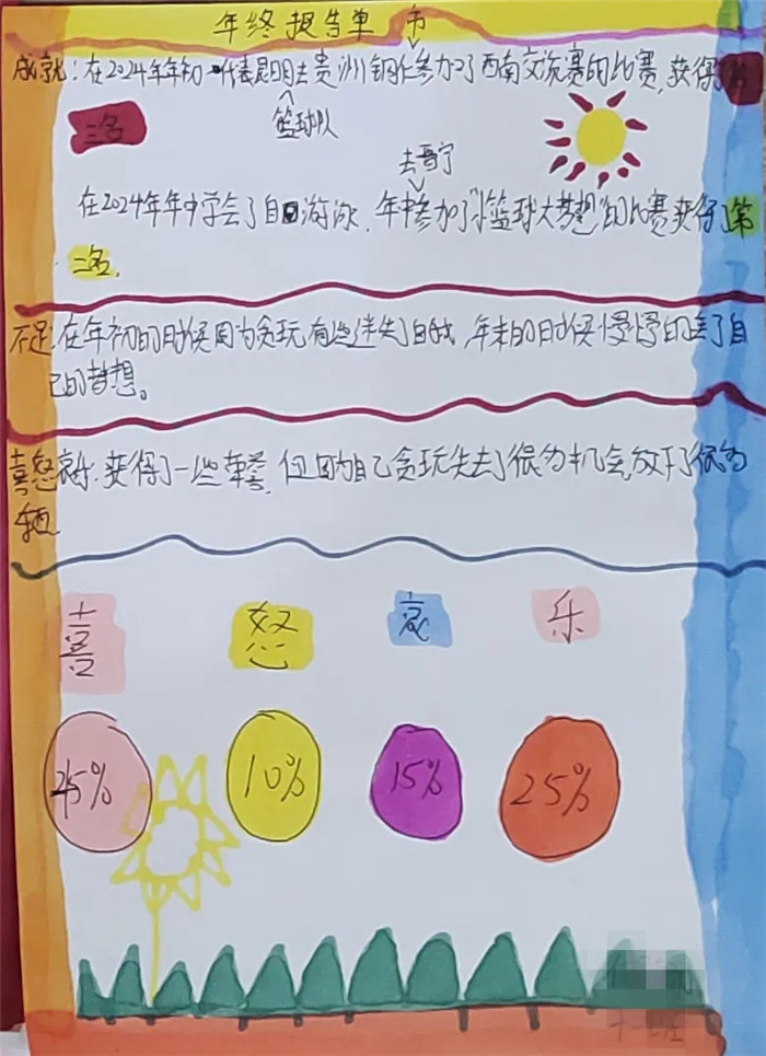 孩子們的“年終報(bào)告”各具特色,有的色彩豐富,有的創(chuàng)意十足,有的重點(diǎn)記錄了自己一整年的情緒起伏,有的則記錄了對(duì)自己意義非凡的事件,還有的書寫了成長(zhǎng)與感悟……