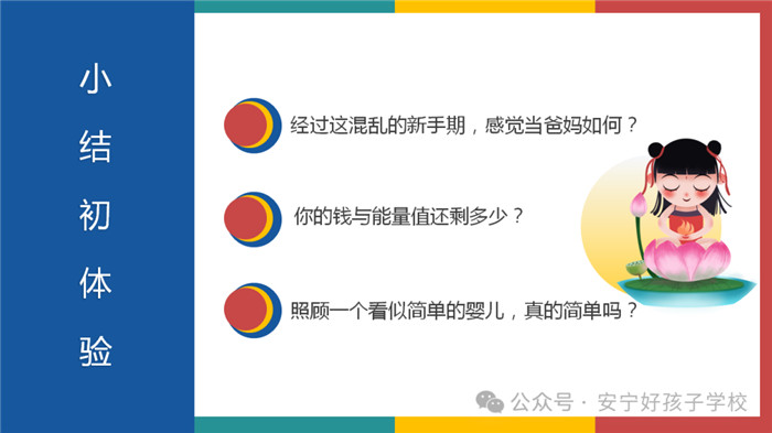 “現(xiàn)在啟動育兒模擬,每組將隨機獲得不同屬性的寶寶! 張老師的話音剛落,教室里的氛圍立刻變得緊張又興奮起來。抽到“天使寶寶”的小組歡呼雀躍,仿佛已經(jīng)勝券在握;而抽到“高需求寶寶”的小組則瞬間哀嚎一片,滿臉愁容。在這個模擬環(huán)節(jié)中,孩子們遭遇了多重挑戰(zhàn)。財務危機首當其沖,新生兒必需品的各項開支,如奶粉、尿布、嬰兒車等,讓原本設定的“家庭存款”快速減少;精力考驗接踵而至,每三小時一次的喂奶設定,徹底打亂了同學們的正常作息,讓他們真切體會到“黑眼圈是怎么煉成的”;而凌晨的“寶寶夜醒”環(huán)節(jié),更是成為了許多同學的“噩夢”,哭鬧不止的“寶寶”,直接讓大半同學累趴桌上,直呼“撐不住”。