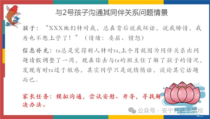 在“厭學危機”情景里,面對“女兒”的哭訴:“他們都說我矯情……我不想去學校!”扮演家長的同學一時手足無措,只能無奈地給孩子講起大道理,卻無法真正走進孩子的內心,給予有效的安慰。