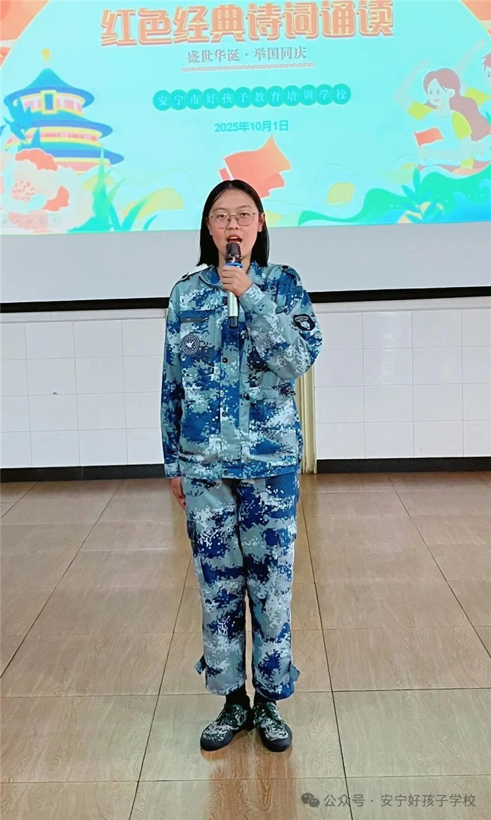 隨后的“紅色經(jīng)典詩(shī)詞誦讀”活動(dòng)同樣精彩紛呈。從《沁園春·雪》的豪邁壯闊,到《七律·長(zhǎng)征》的堅(jiān)韌不屈;從《少年中國(guó)說》的朝氣蓬勃,到《我驕傲,我是中國(guó)人》的熱血沸騰...... 同學(xué)們或獨(dú)誦、或合誦,搭配生動(dòng)的肢體語言與情感飽滿的語調(diào),將詩(shī)詞里的紅色故事娓娓道來。臺(tái)下師生仿佛穿越時(shí)空,在朗朗書聲中重溫革命歲月,讓紅色文化浸潤(rùn)心靈。